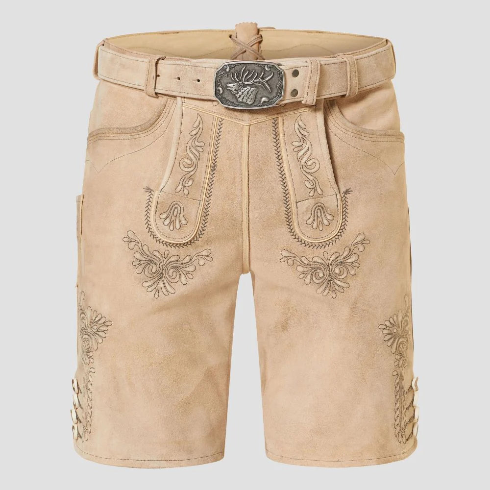 Here are the components of men's lederhosen shorts, exemplifying their unique adornments.