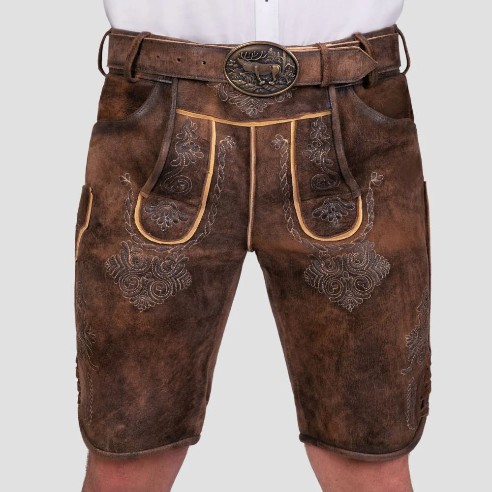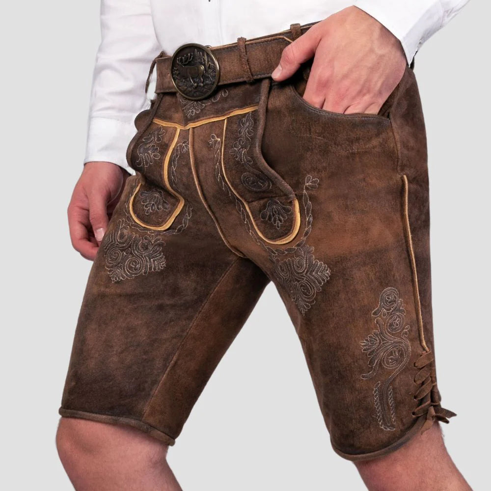 Here are the components of men's lederhosen shorts, exemplifying their unique adornments.