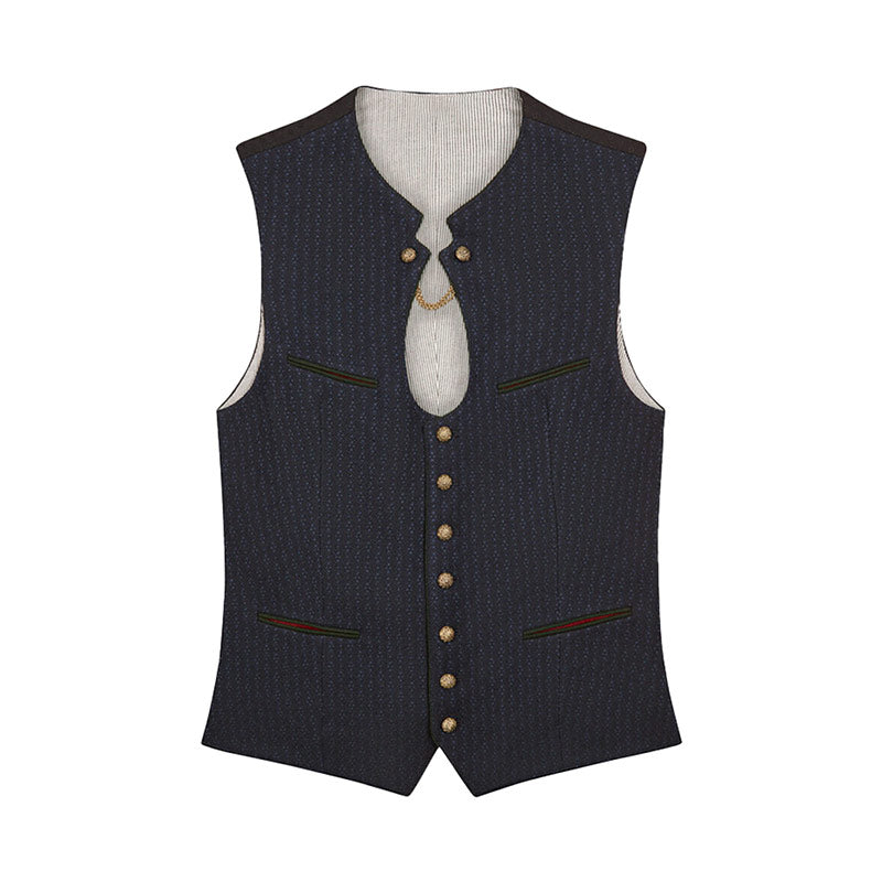 Design: Bavarian vest with Four welt pockets (two on top, two below), Antique gold-toned buttons,