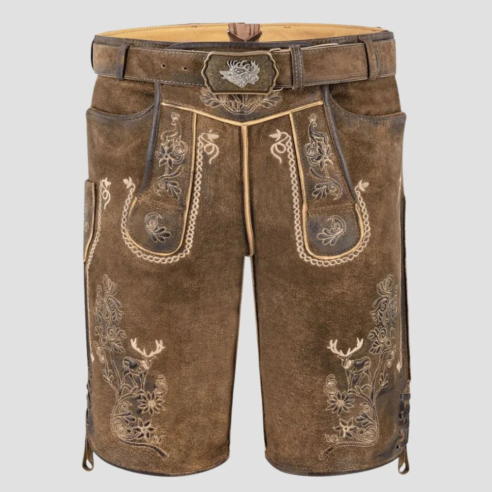Here are the components of men's lederhosen shorts, exemplifying their unique adornments.