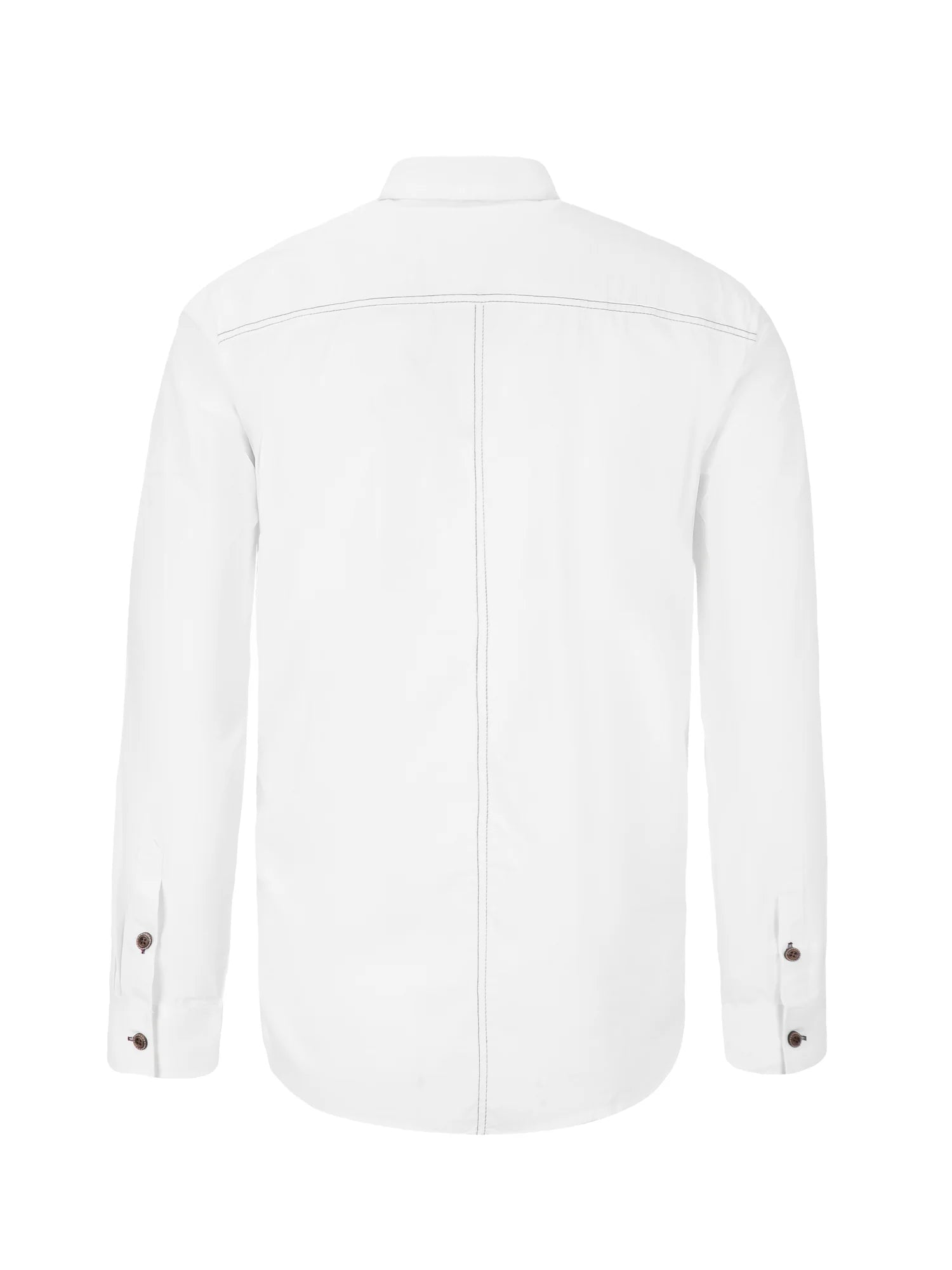 Design: white shirt with real metal buttons, black double stitching, check pattern inside collar and placket, full German charm