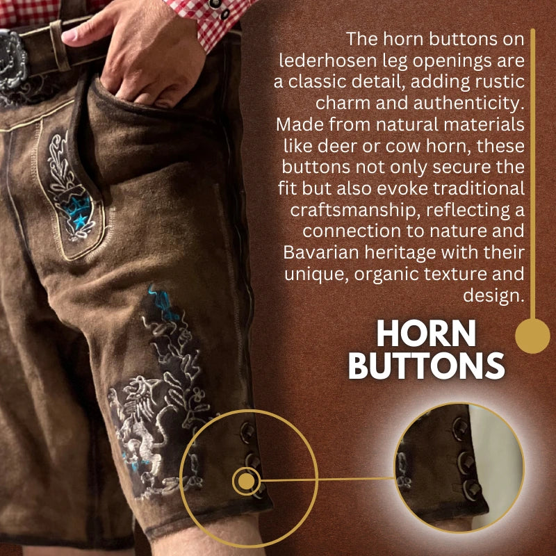 Here are the components of men's lederhosen shorts, exemplifying their unique adornments.